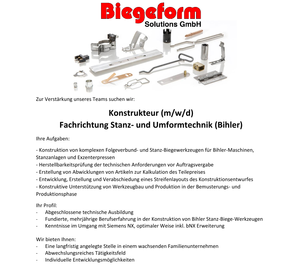 Die Biegeform Solutions GmbH ist Hersteller komplexer Stanz- und Biegeteile aus Band und Draht. Der moderne Maschinenpark mit Bihler Stanz-Biegeautomaten und Stanzautomaten wird mit dem eigenen Werkzeugbau und Konstruktion unterstützt.